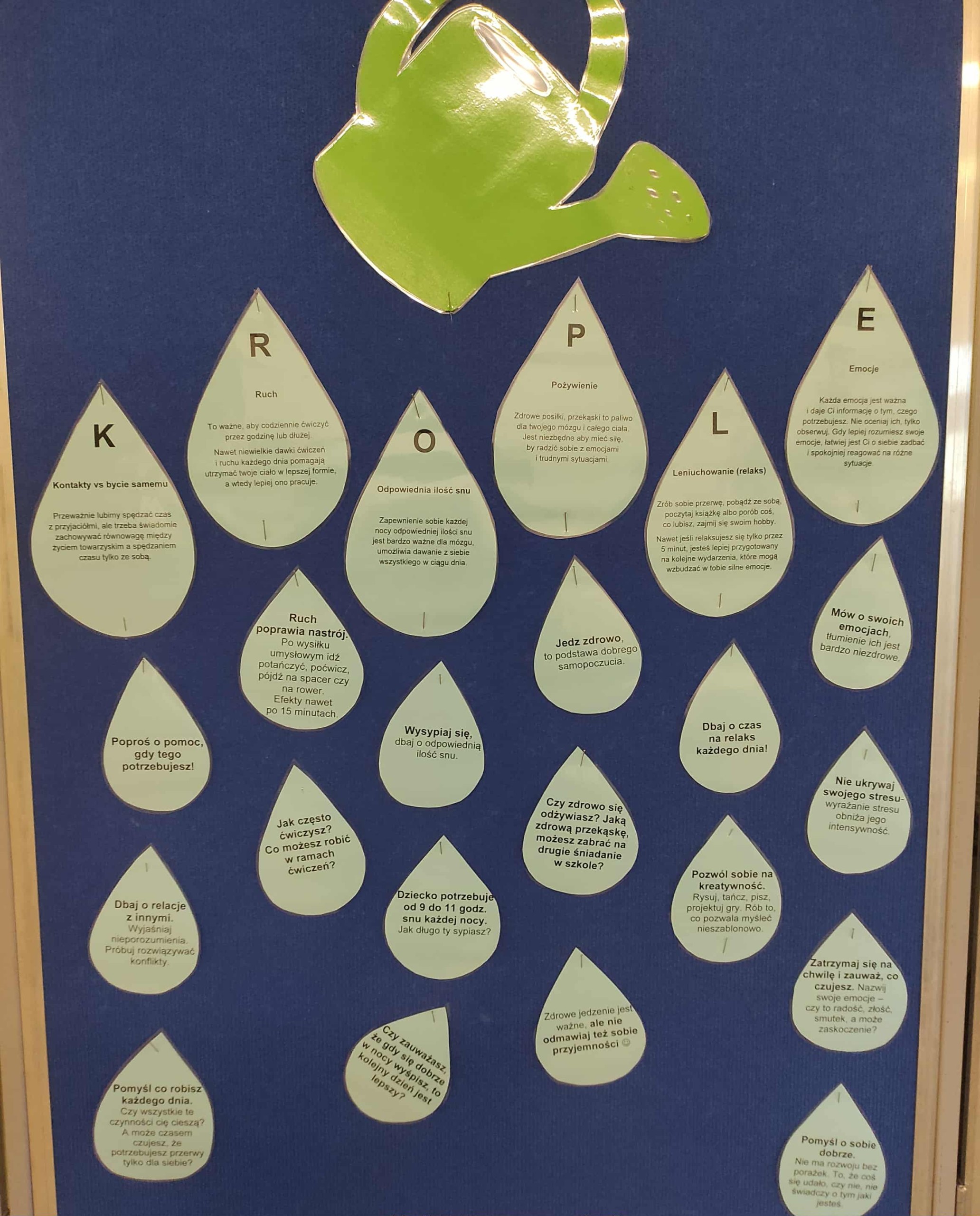 Uczniowie, przechodząc przez kolejne stacje, odkrywali, jak dbać o siebie w różnych obszarach zdrowia psychicznego – zgodnie z akronimem słowa KROPLE:
