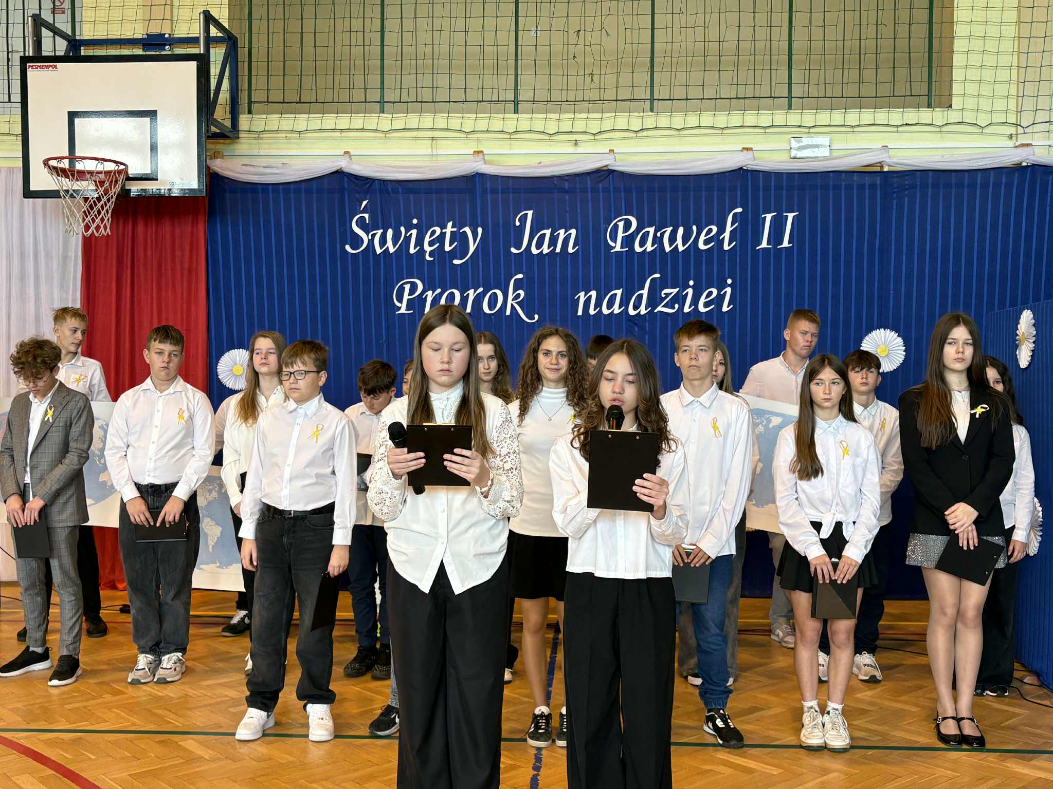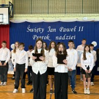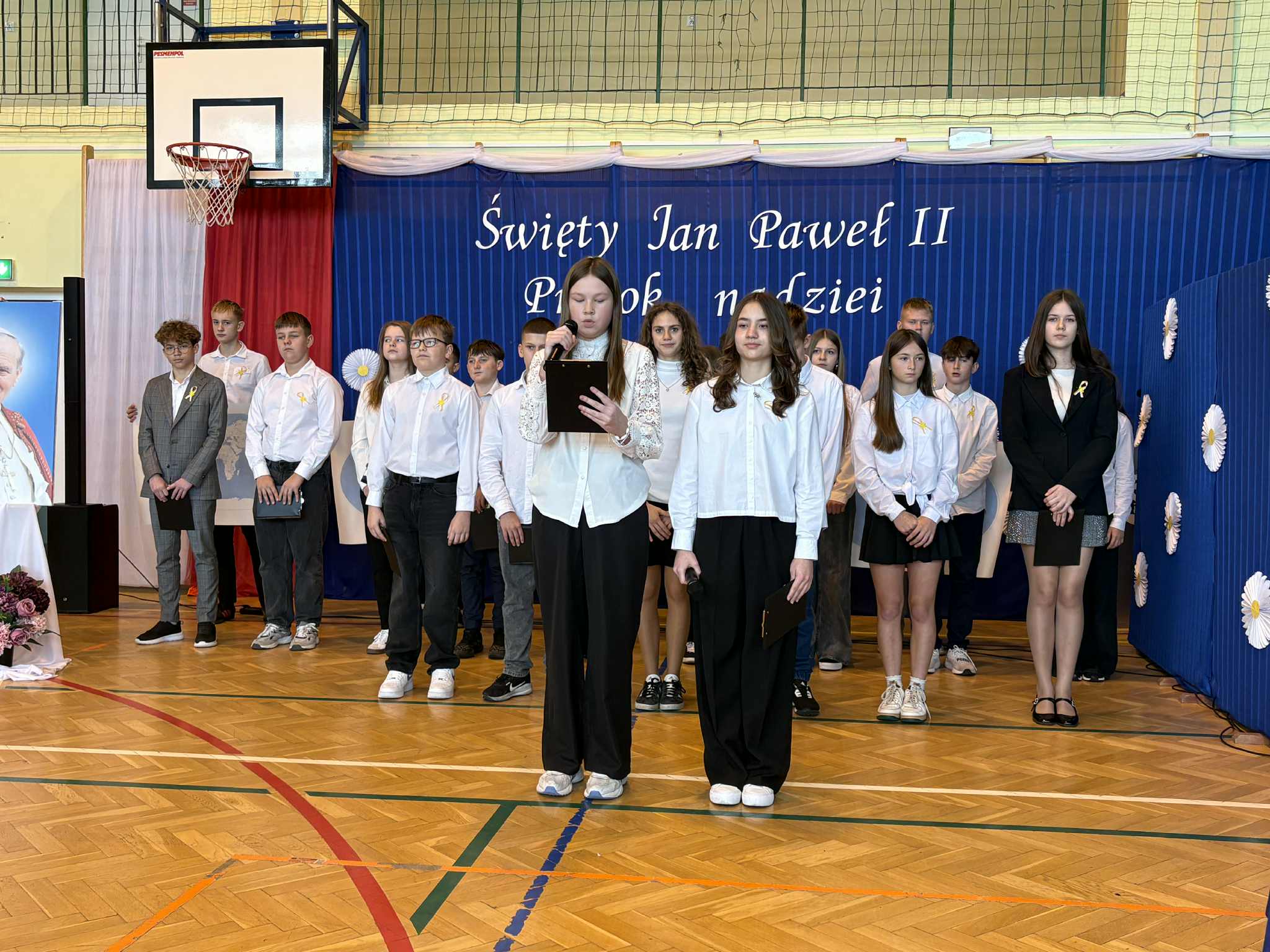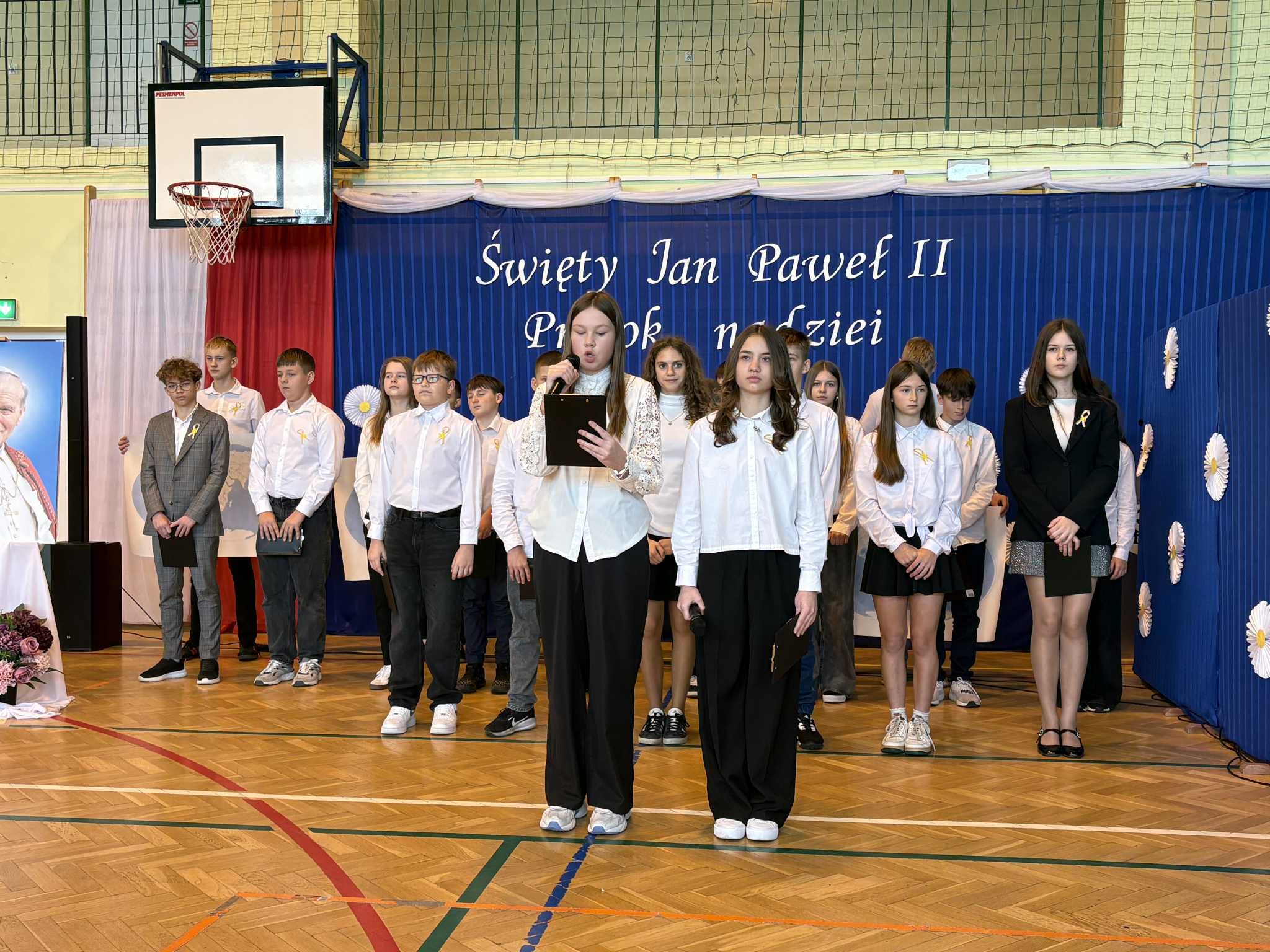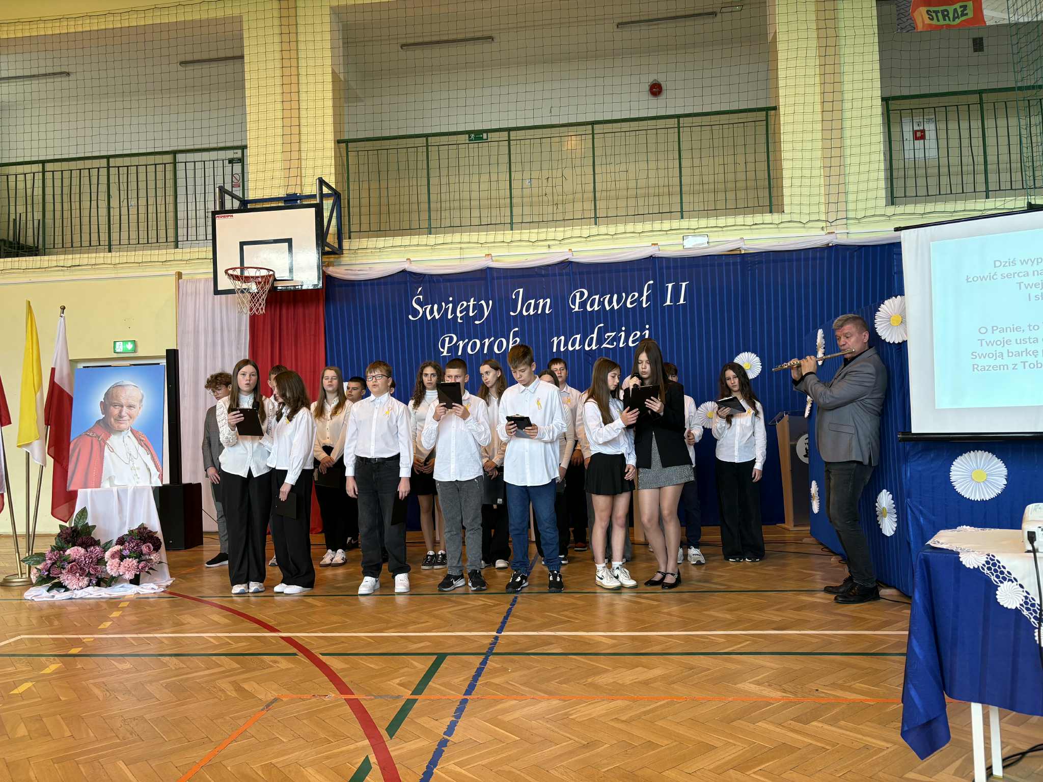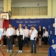 Program artystyczny wzbogaciły nastrojowe wiersze oraz fragmenty homilii Ojca Świętego, które skłaniały do refleksji nad wartościami, jakimi kierował się Jan Paweł II. Szczególnym i niezwykle wzruszającym momentem była wspólna pieśń „Barka” – ukochana przez Papieża – która zabrzmiała z głębi serc całej społeczności szkolnej, tworząc atmosferę modlitwy, wdzięczności i jedności.