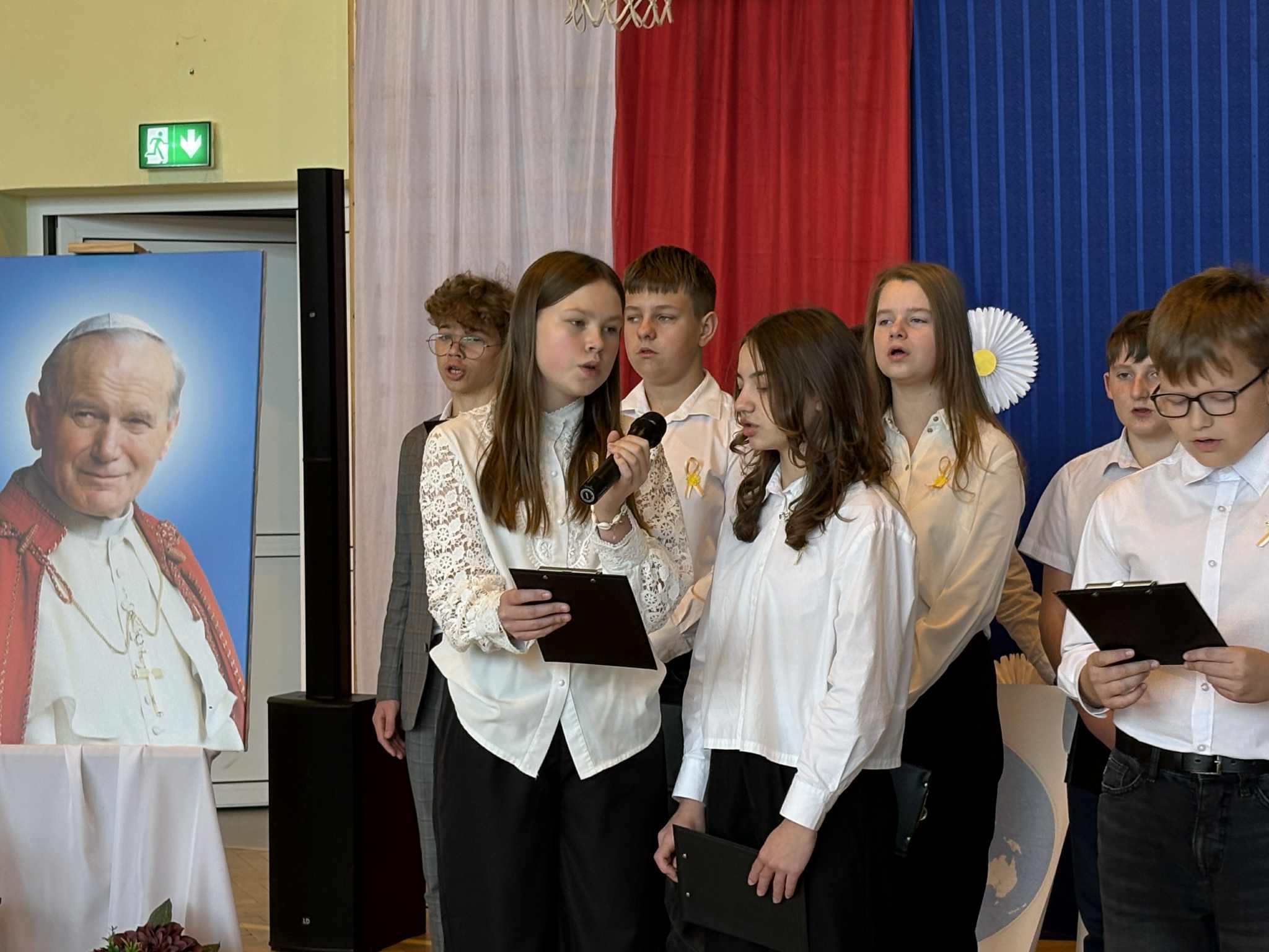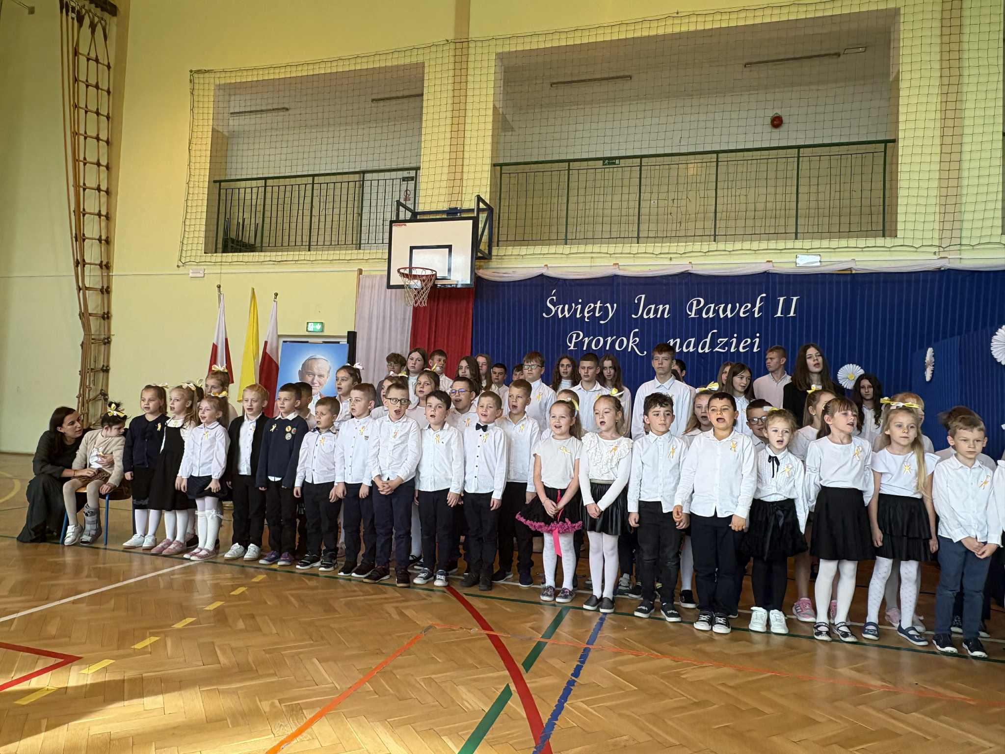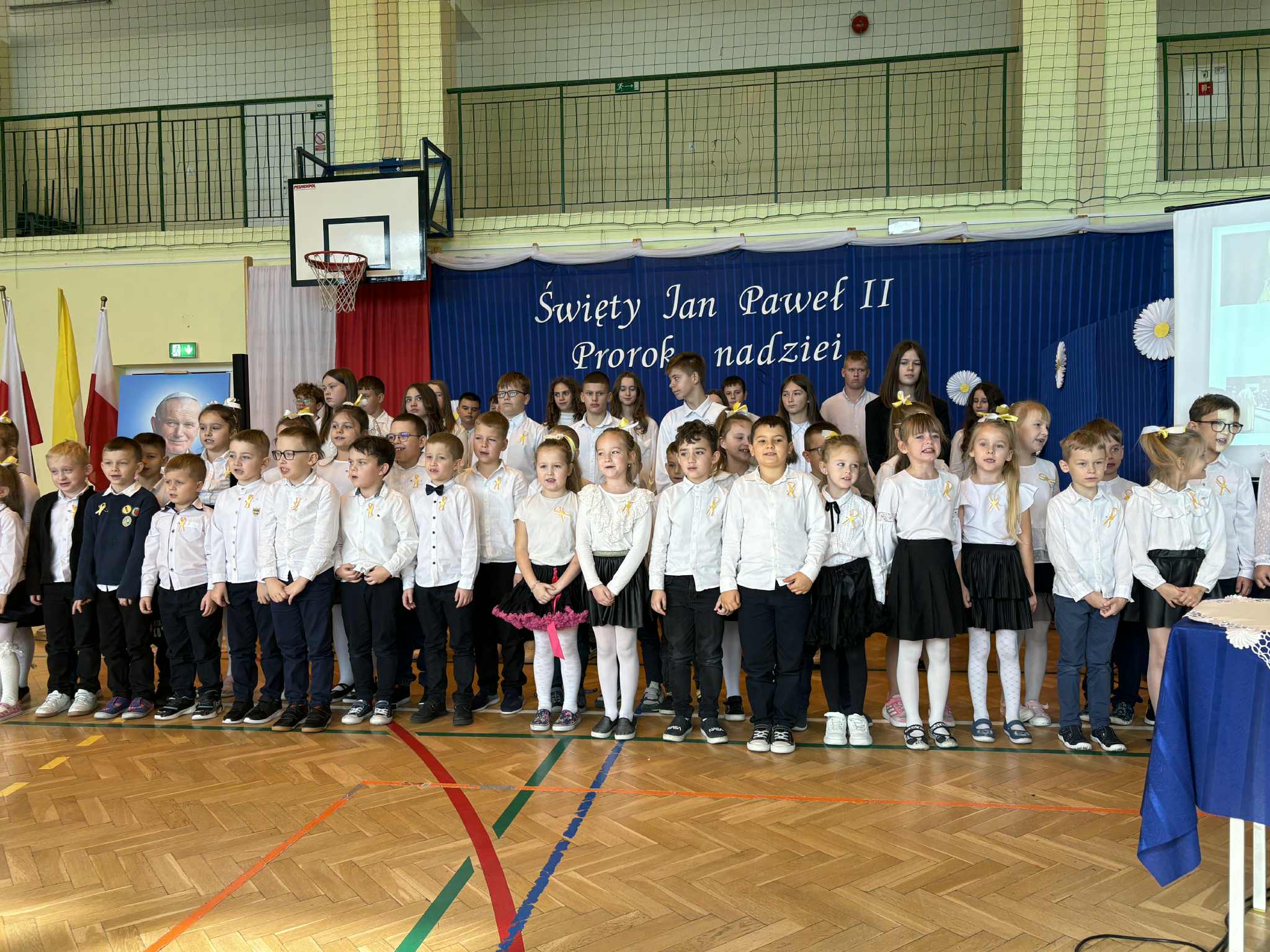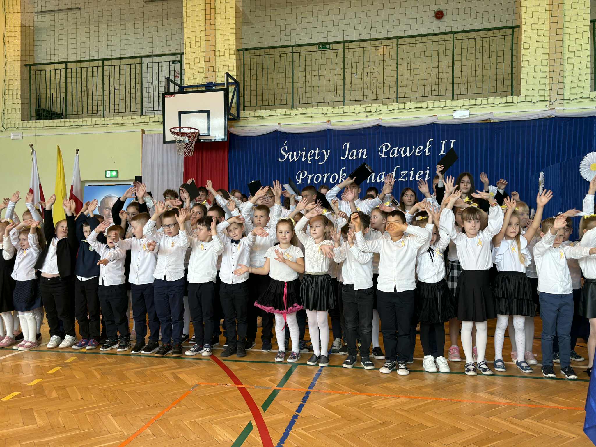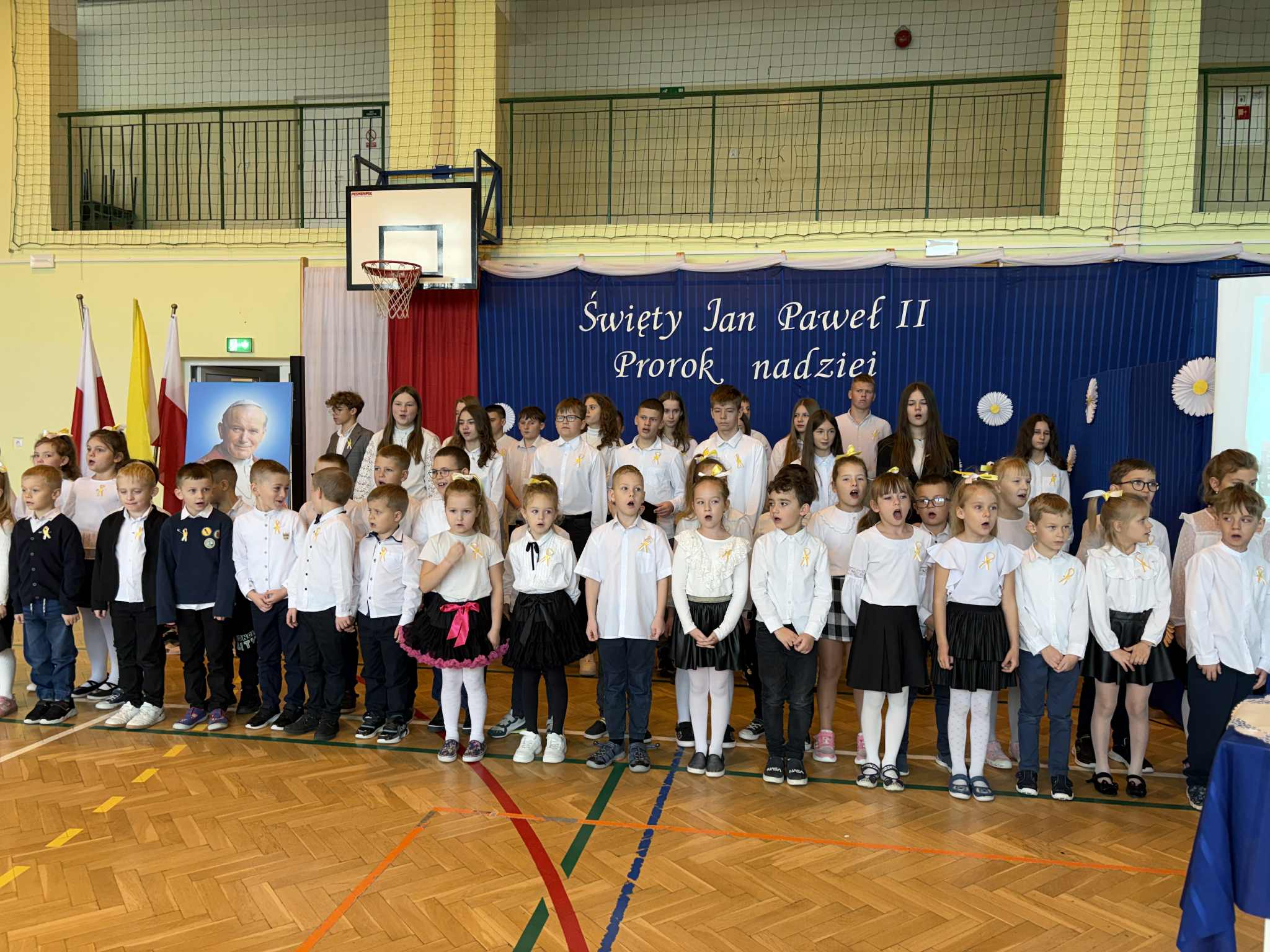 Uroczystość uświetniły również występy wokalne uczniów klas Ia i Ib, którzy z wielkim przejęciem i radością wykonali pieśń „Ty wyzwoliłeś nas, Panie”, oddając hołd Świętemu Janowi Pawłowi II i jego nieustającemu przesłaniu miłości do Boga i człowieka.