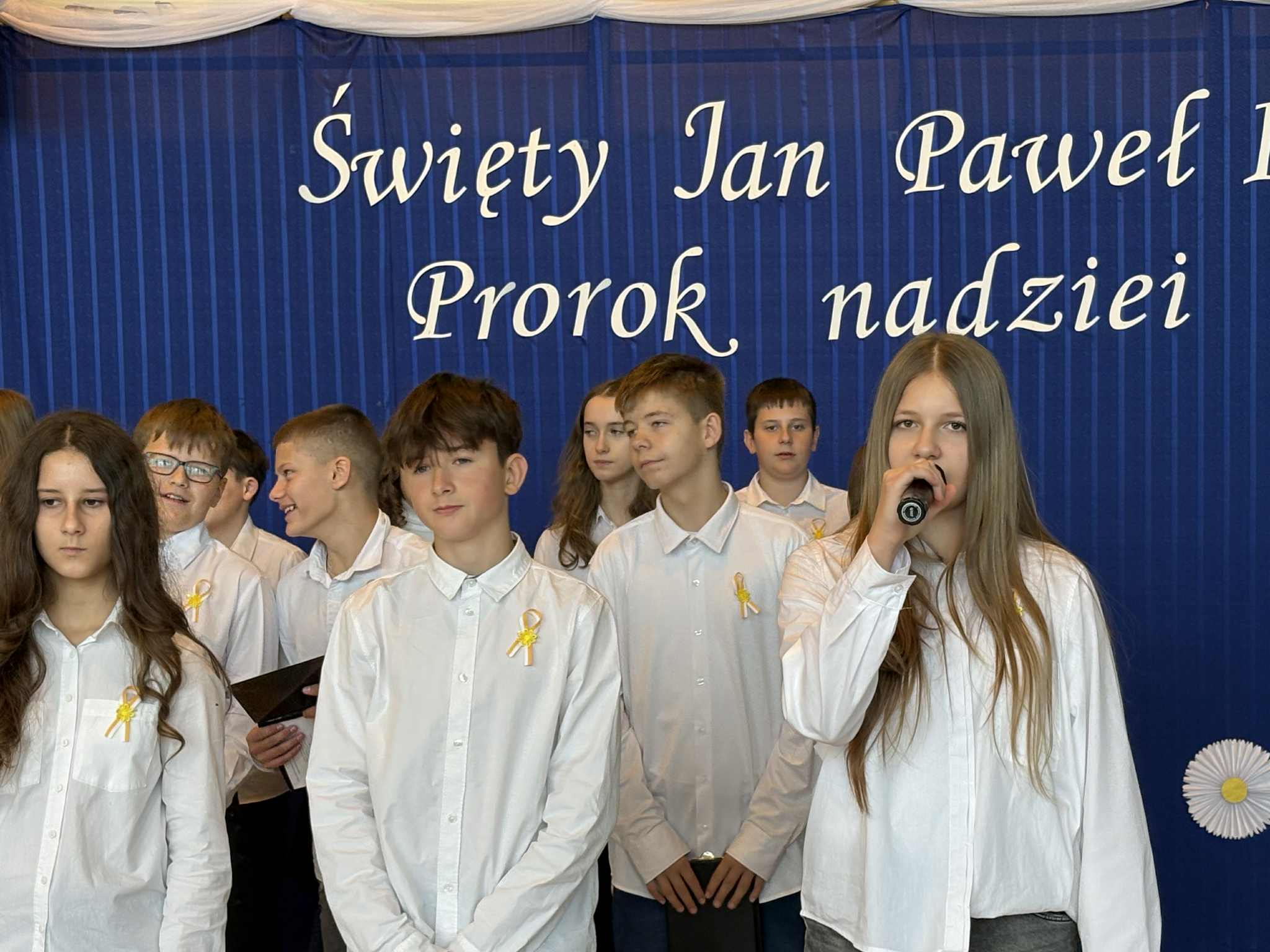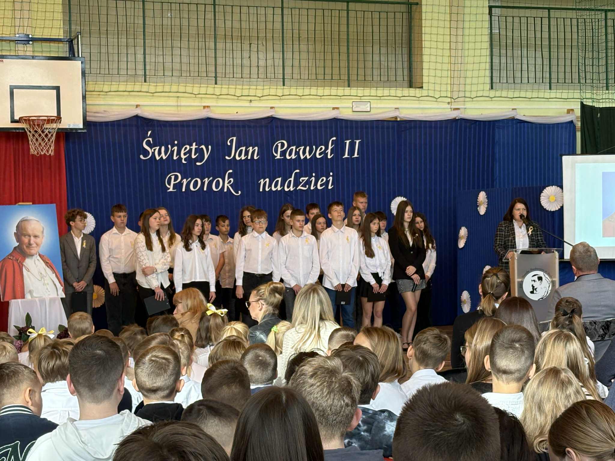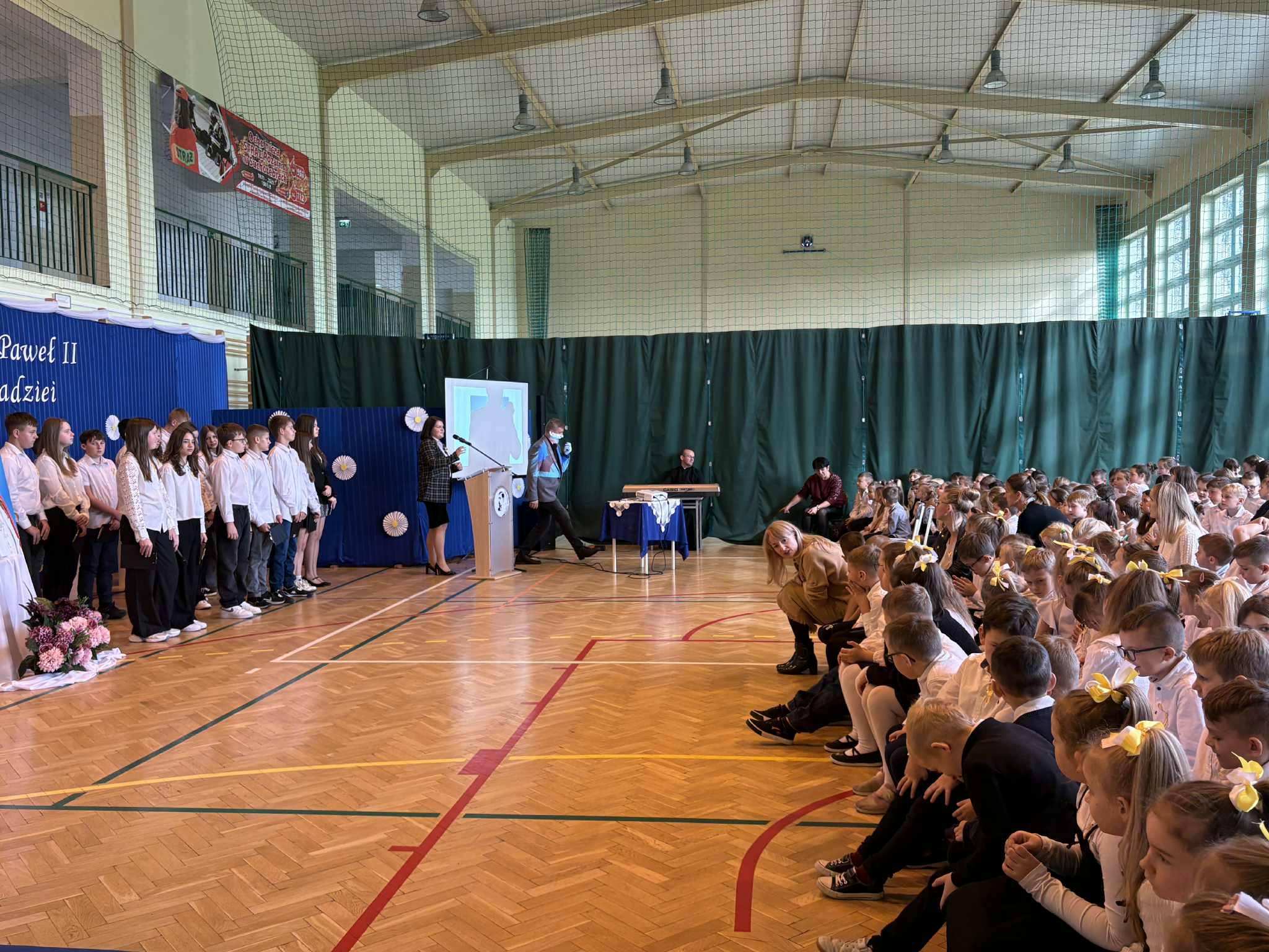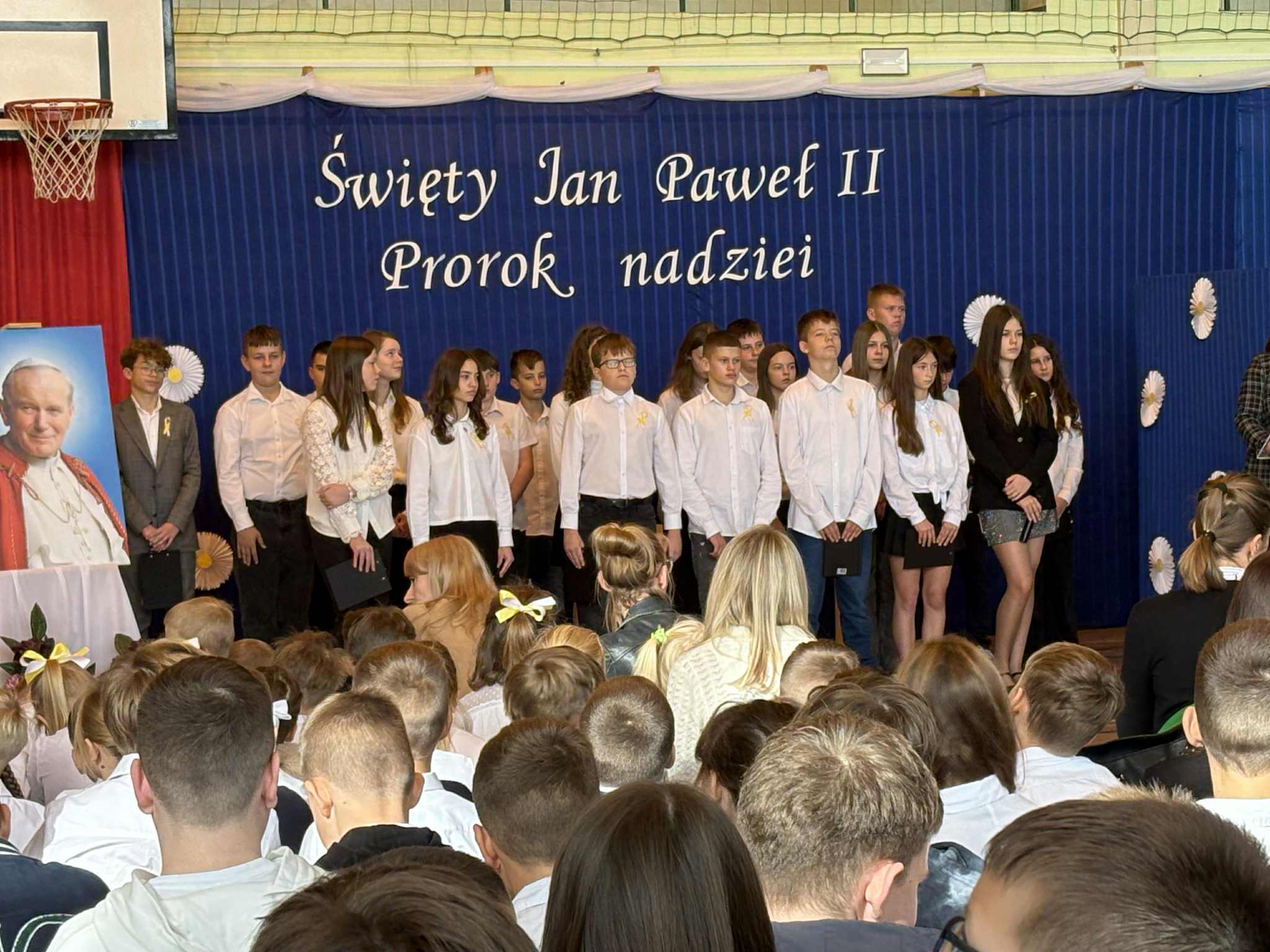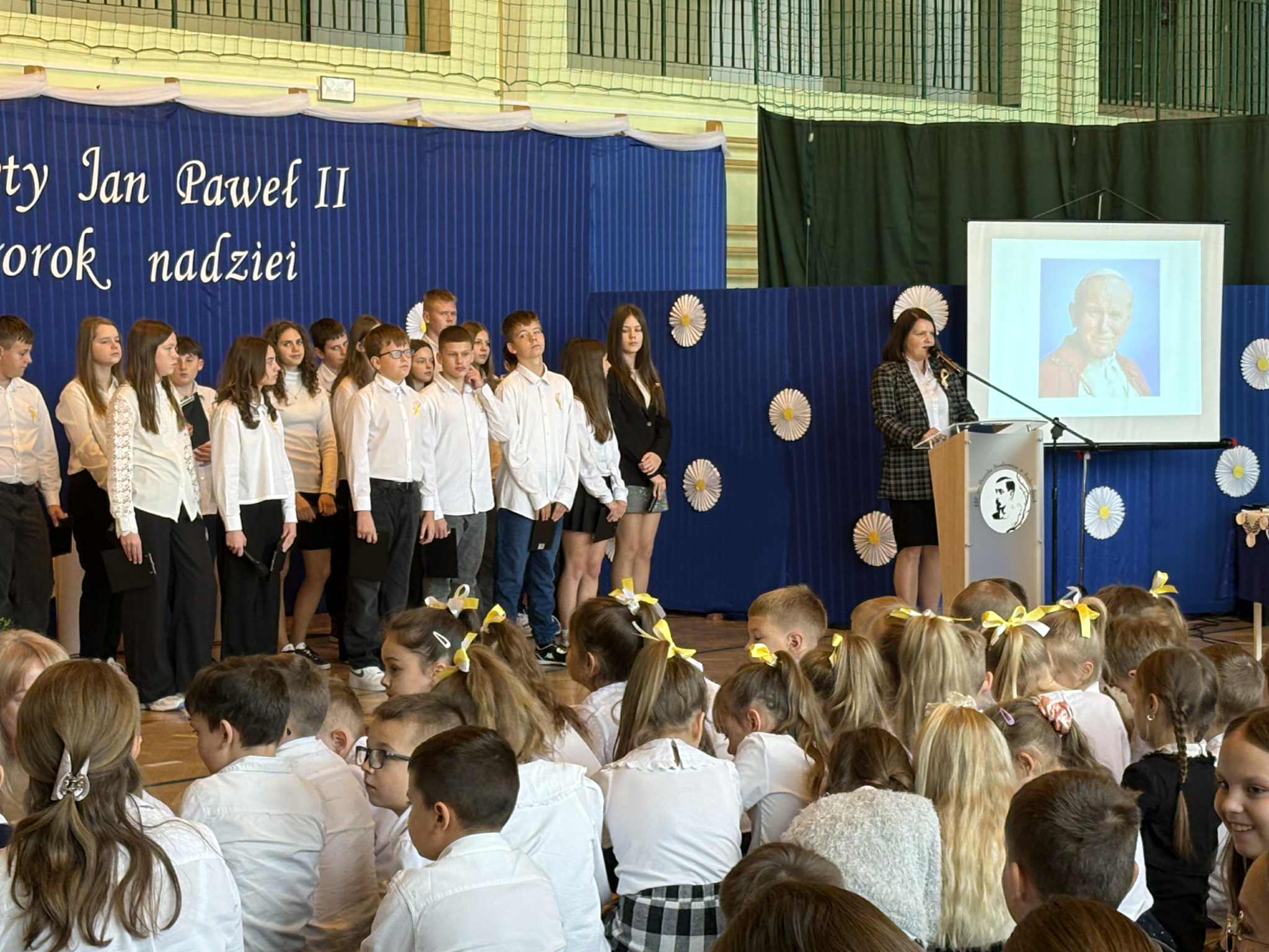 Uroczystość uświetniły również występy wokalne uczniów klas Ia i Ib, którzy z wielkim przejęciem i radością wykonali pieśń „Ty wyzwoliłeś nas, Panie”, oddając hołd Świętemu Janowi Pawłowi II i jego nieustającemu przesłaniu miłości do Boga i człowieka.