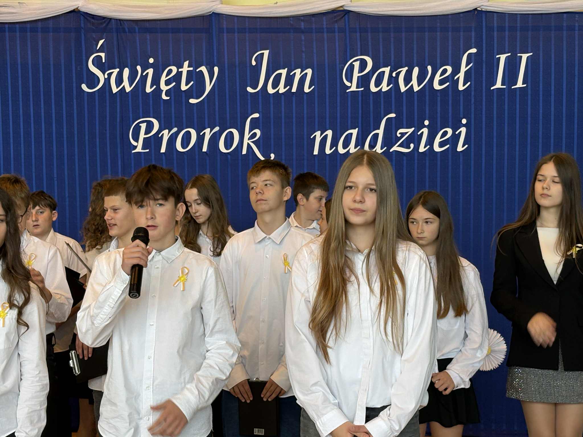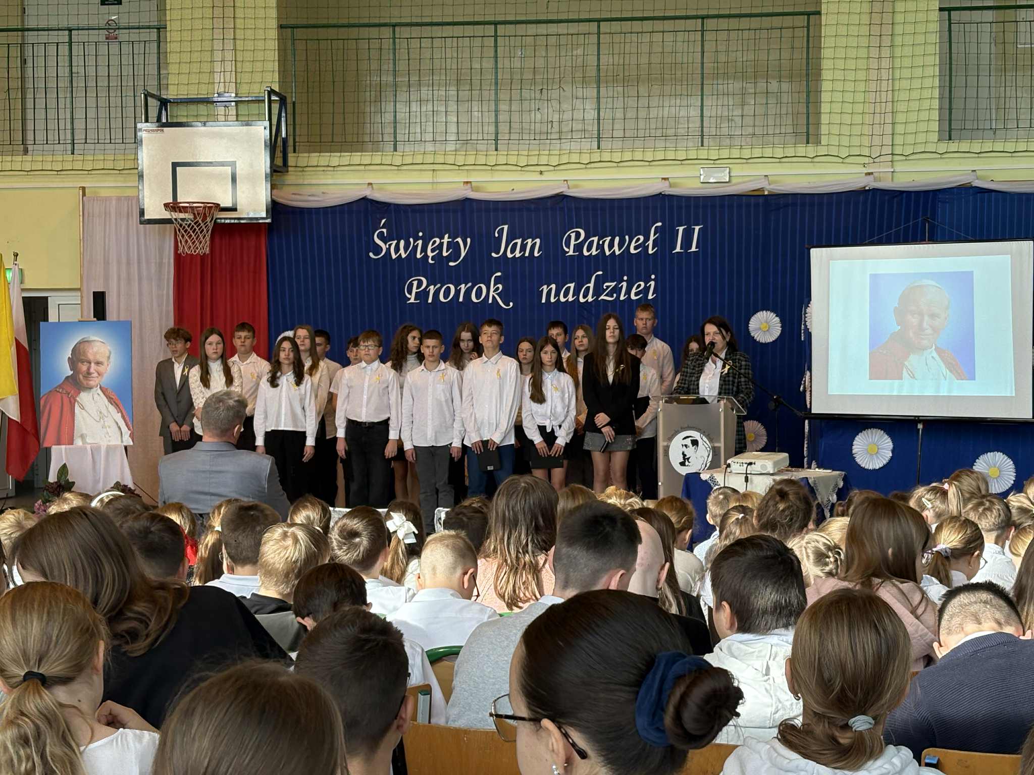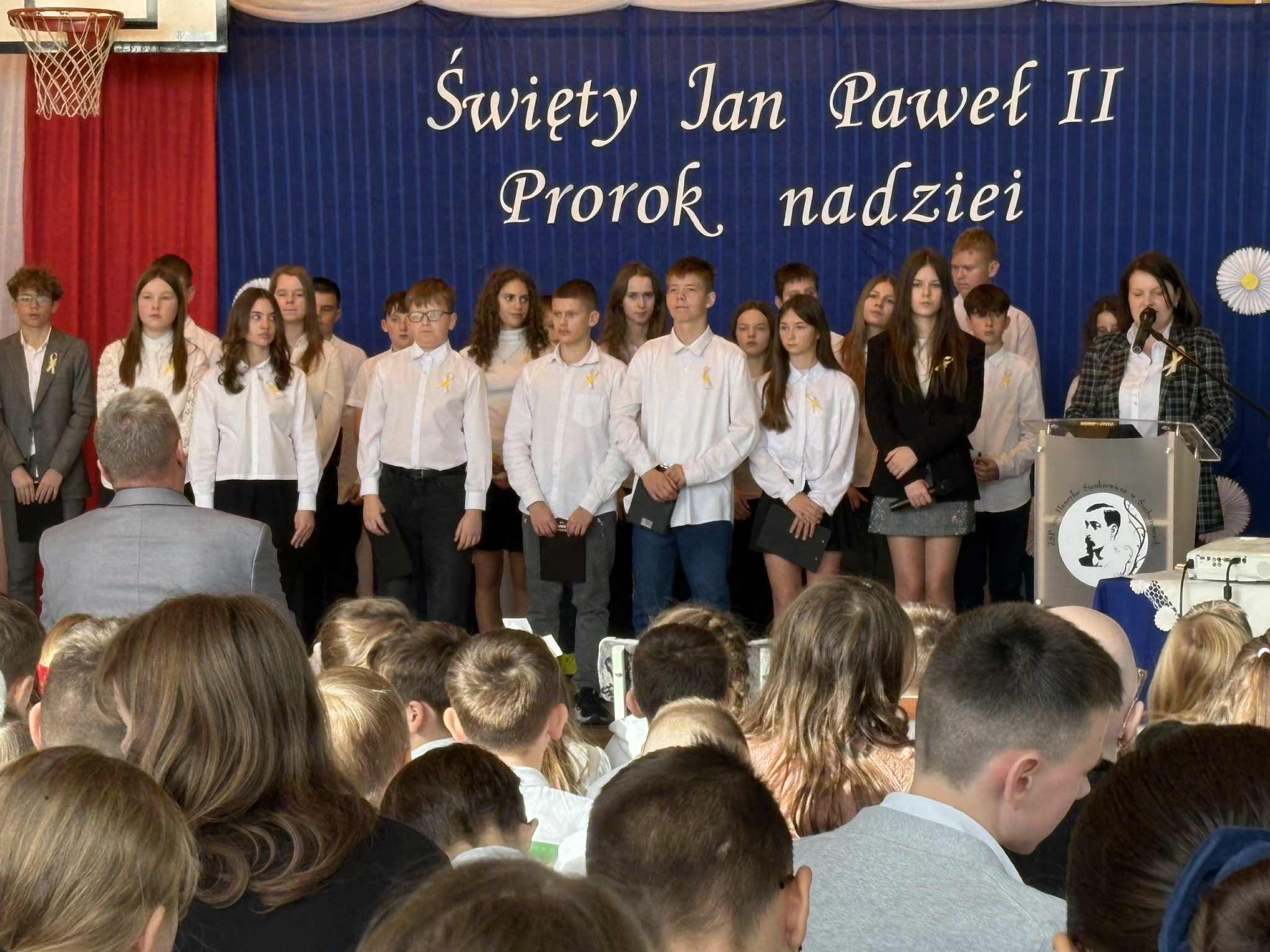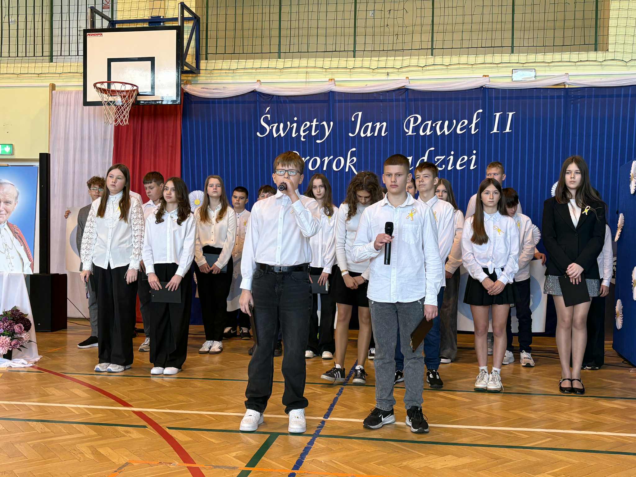 Uroczystość uświetniły również występy wokalne uczniów klas Ia i Ib, którzy z wielkim przejęciem i radością wykonali pieśń „Ty wyzwoliłeś nas, Panie”, oddając hołd Świętemu Janowi Pawłowi II i jego nieustającemu przesłaniu miłości do Boga i człowieka.
