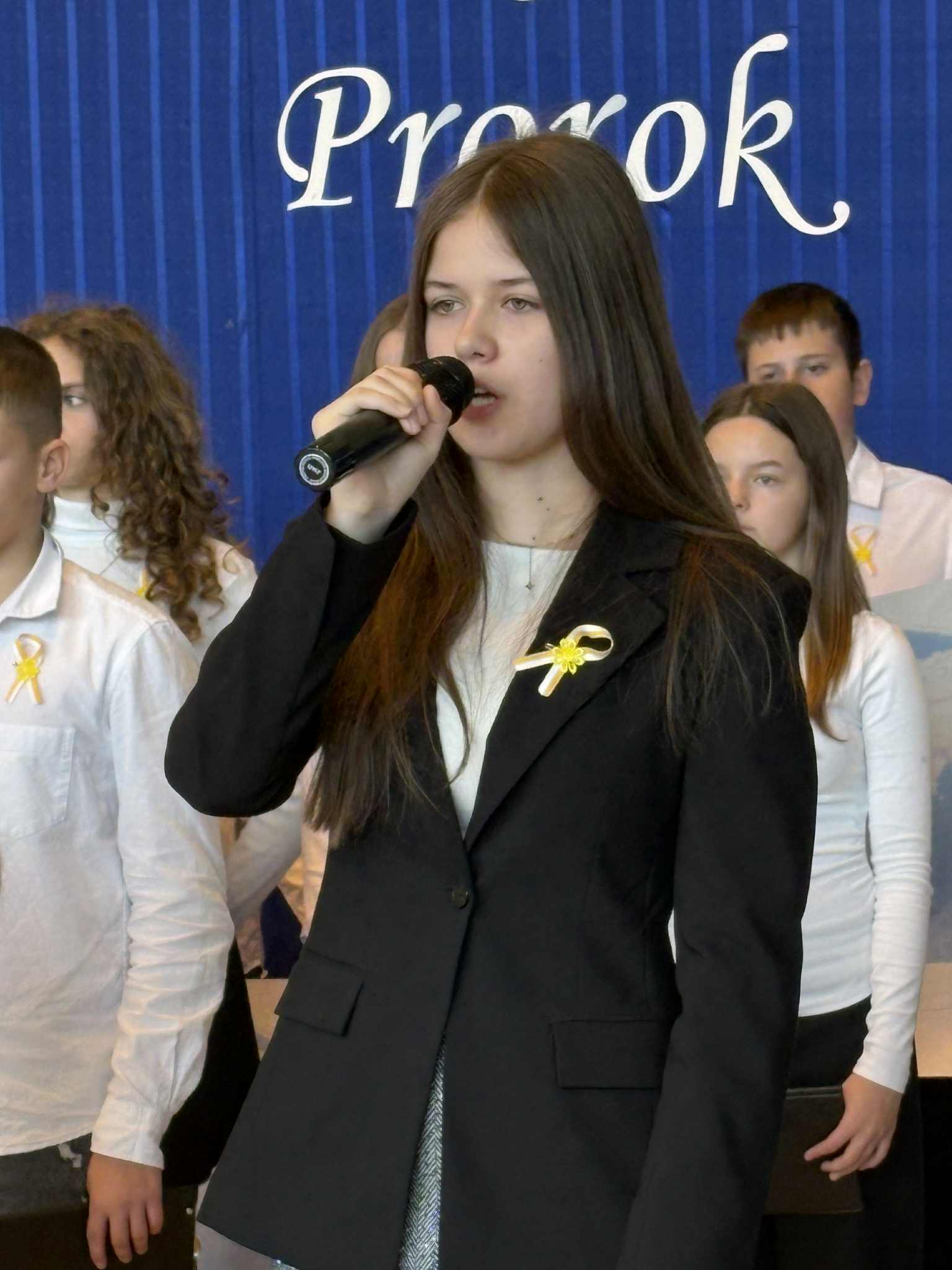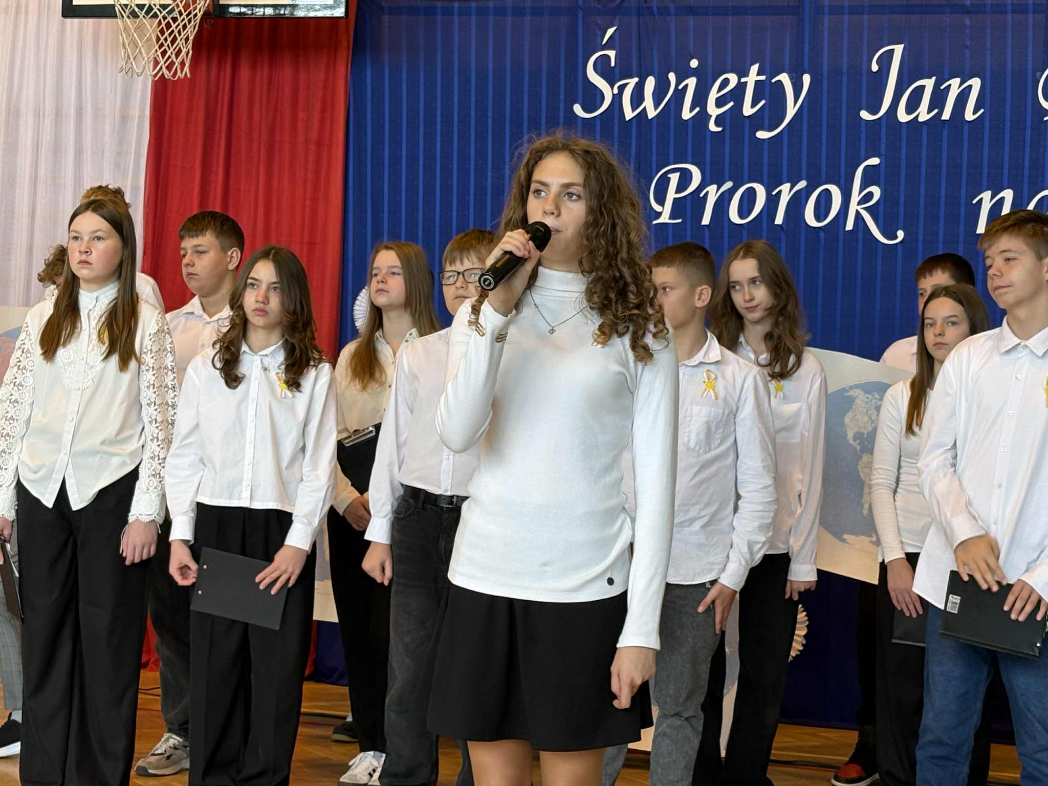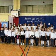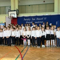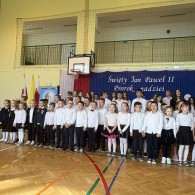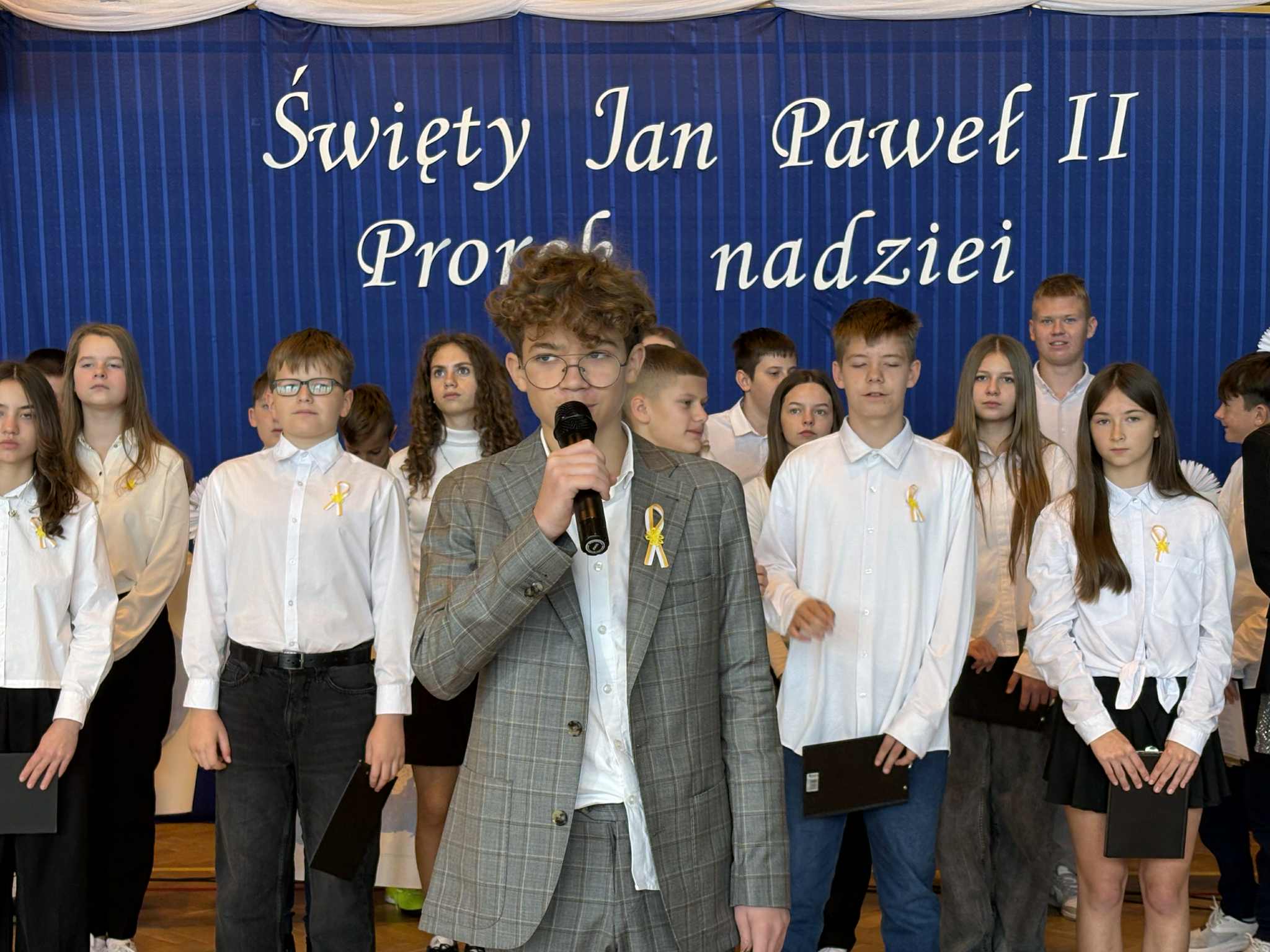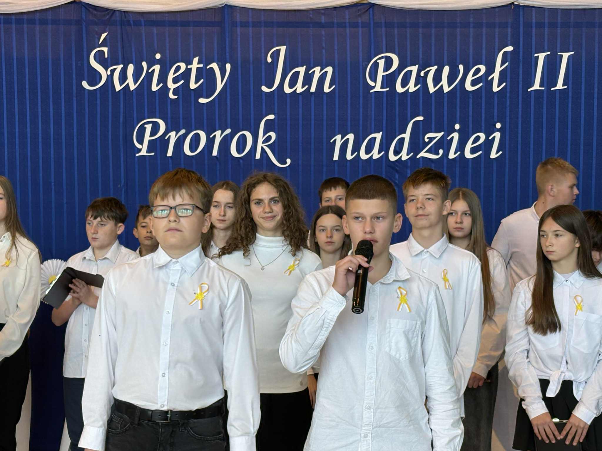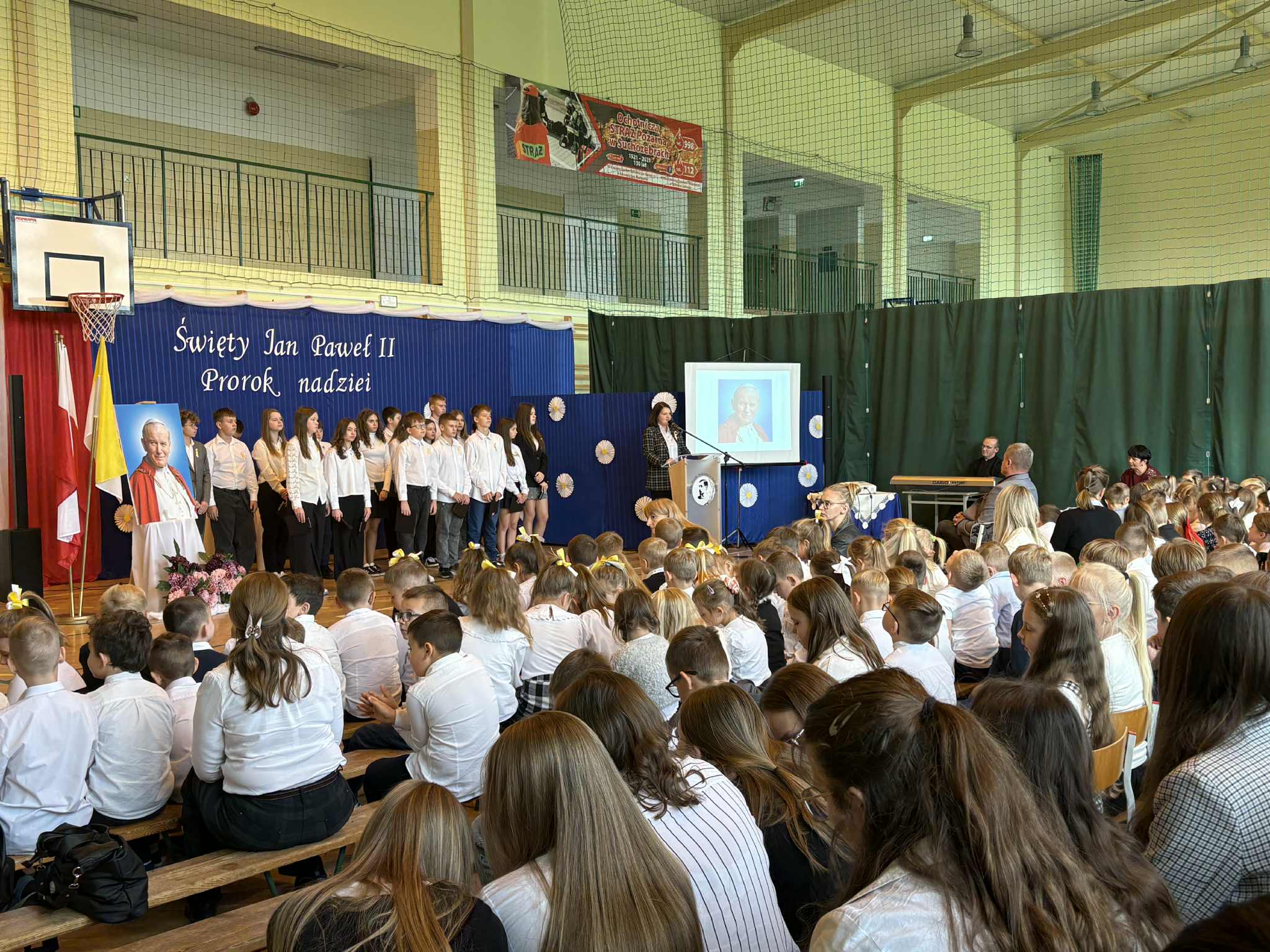 Uroczystość uświetniły również występy wokalne uczniów klas Ia i Ib, którzy z wielkim przejęciem i radością wykonali pieśń „Ty wyzwoliłeś nas, Panie”, oddając hołd Świętemu Janowi Pawłowi II i jego nieustającemu przesłaniu miłości do Boga i człowieka.