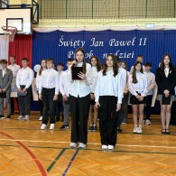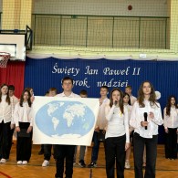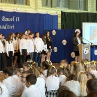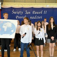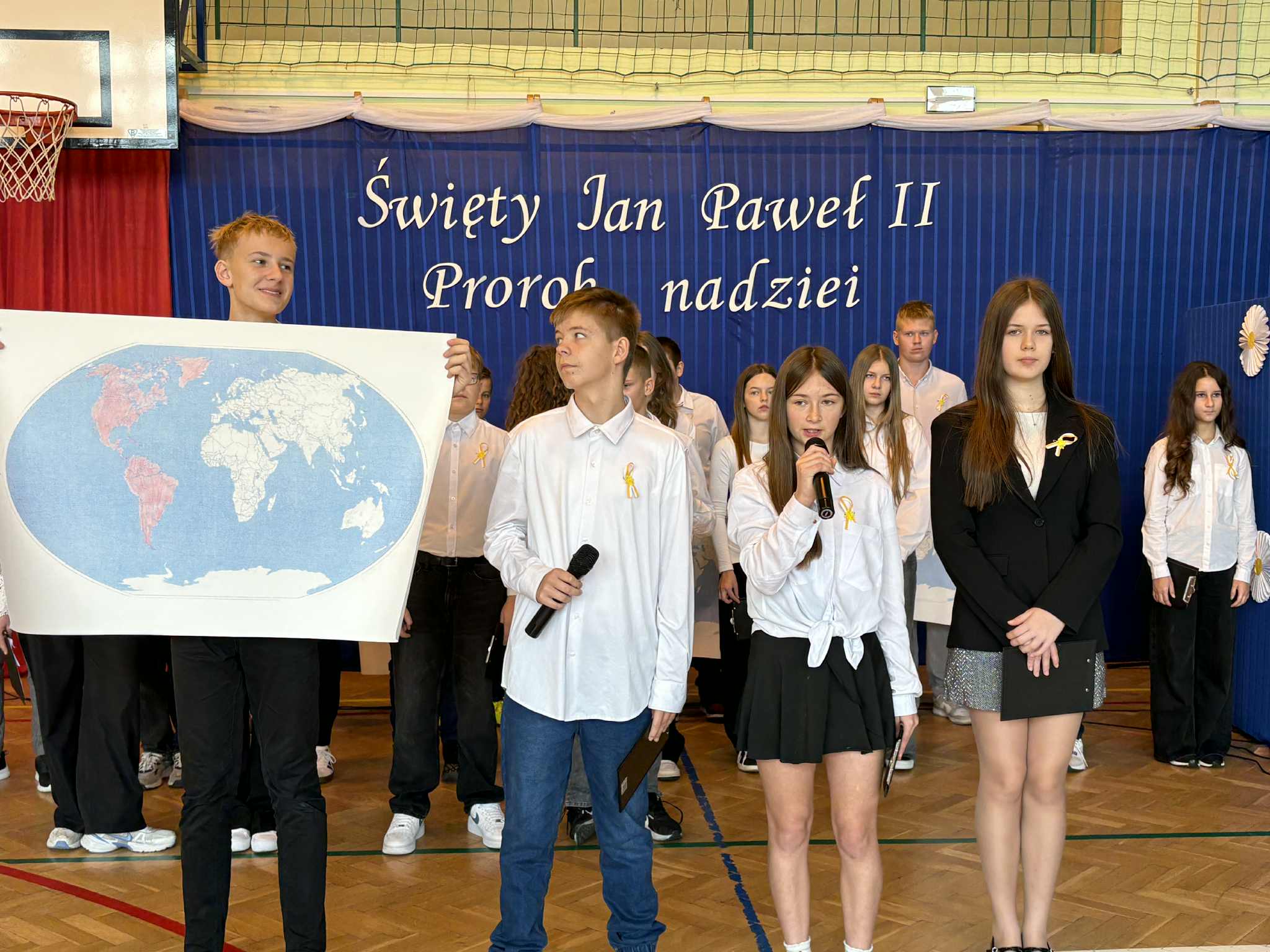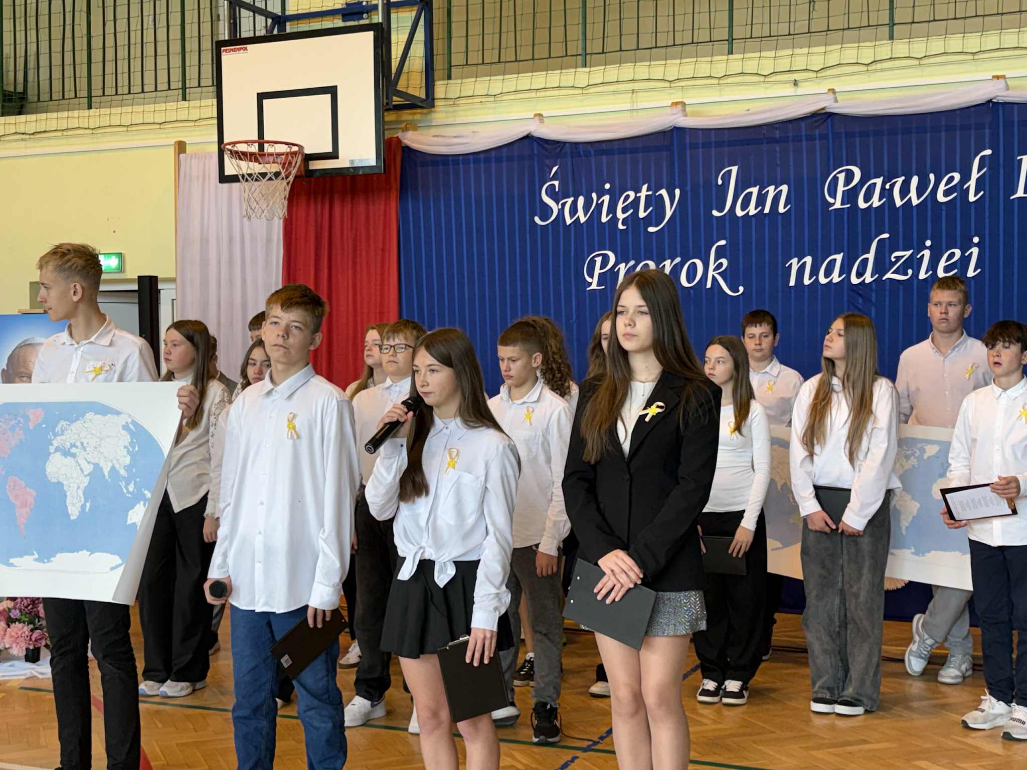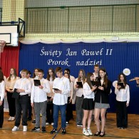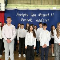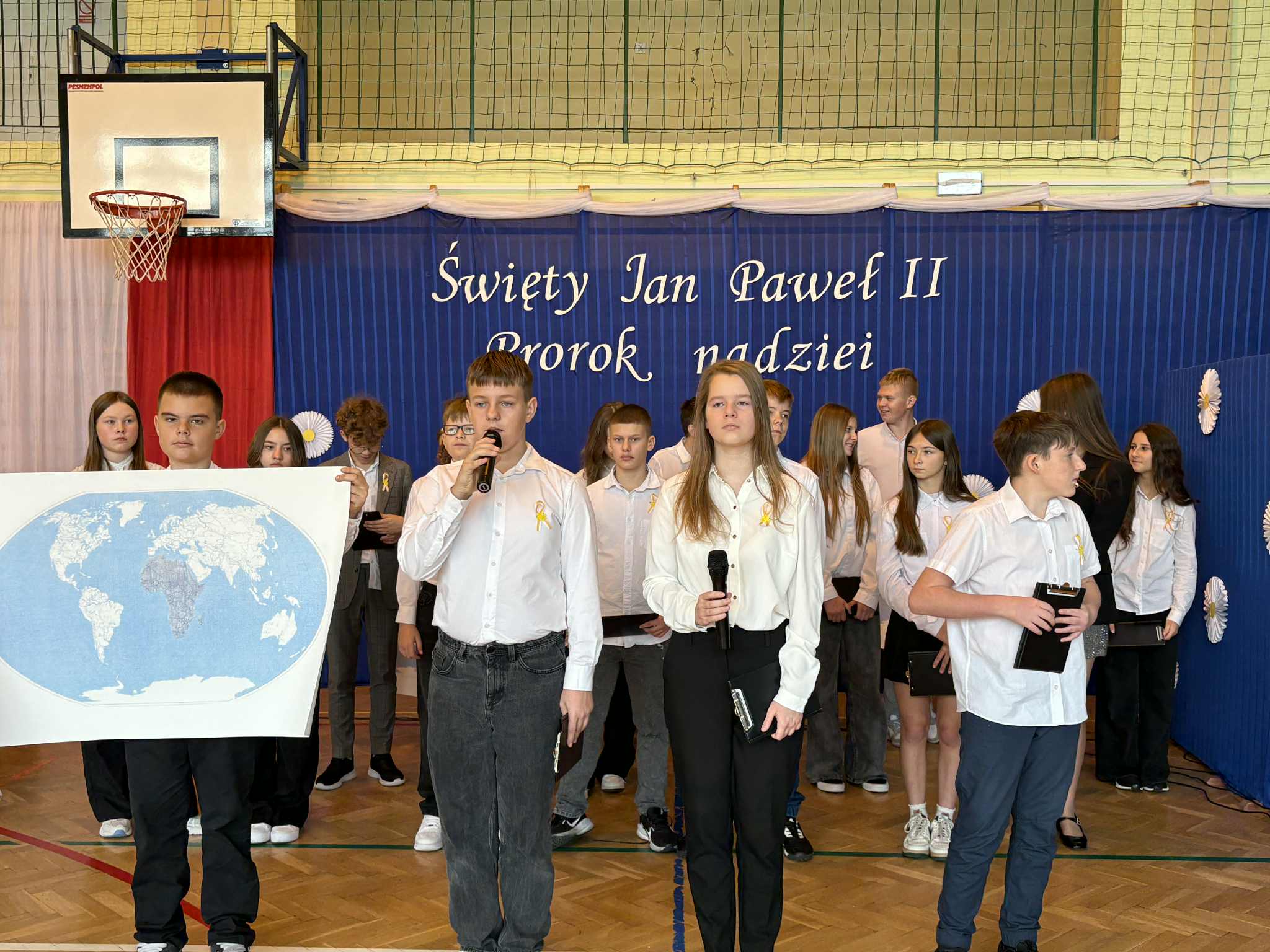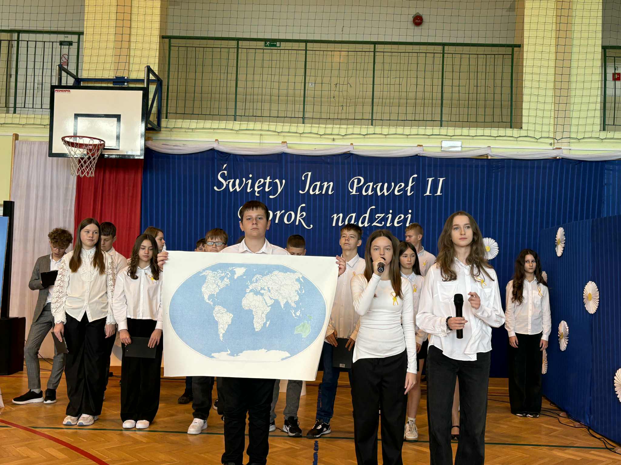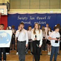 Uczniowie klasy VIIa przygotowali wyjątkowy, głęboko poruszający apel poświęcony Świętemu Janowi Pawłowi II – naszemu Wielkiemu Rodakowi, którego życie i nauczanie pozostają nieustannie źródłem duchowej siły i inspiracji. W swoim występie młodzież przypomniała najważniejsze momenty papieskiego pontyfikatu, pełne miłości przesłanie nadziei oraz niezwykłe pielgrzymki, podczas których Papież niósł światu orędzie wiary, pokoju i dobra.