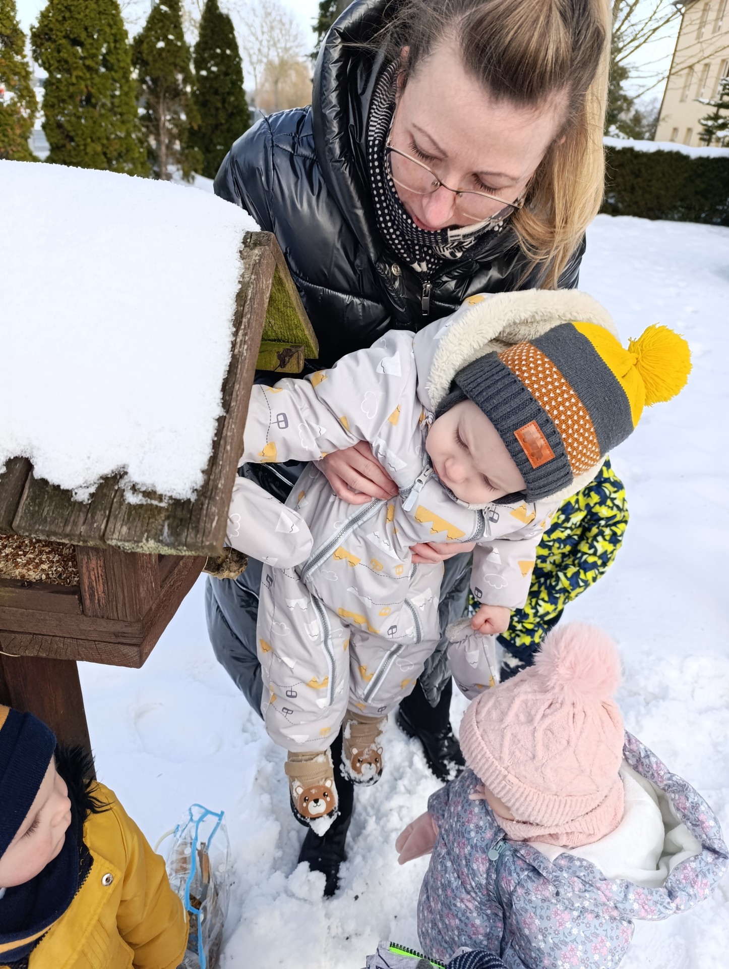 Podczas dzisiejszych zajęć przenieśliśmy się w świat skrzydlatych przyjaciół.Z zainteresowaniem poznawaliśmy różne ptaki, ich wygląd oraz zwyczaje.Bawiąc się karmnikiem, uczyliśmy się jak możemy pomagać im zimą i czym najlepiej je dokarmiać. Z radością dmuchaliśmy kolorowe piórka, obserwując ich lekkość i delikatność.