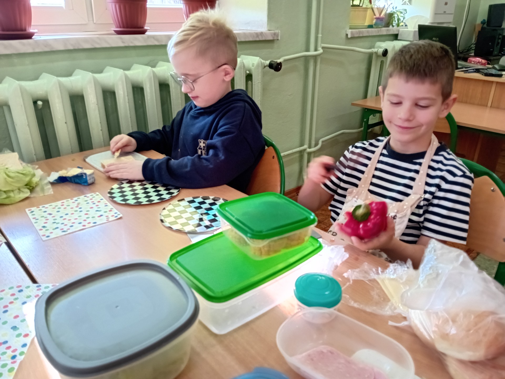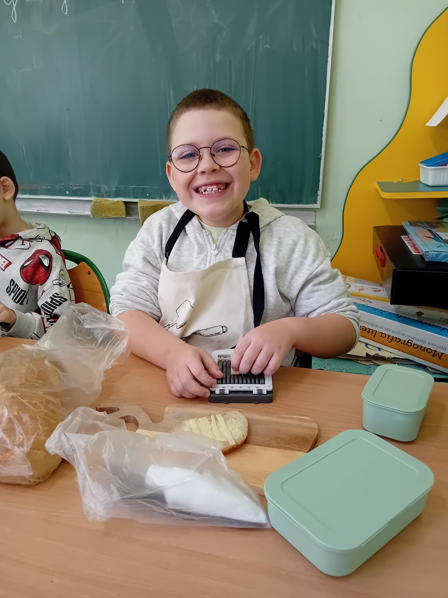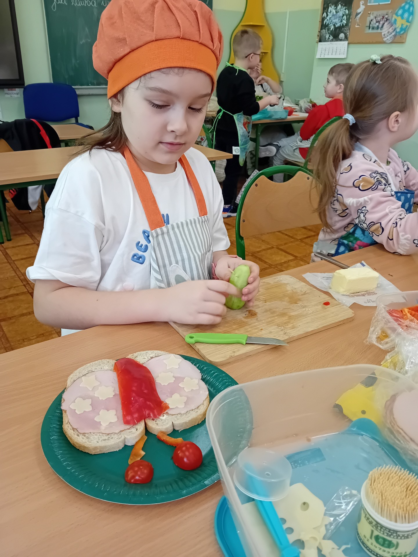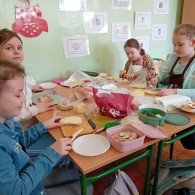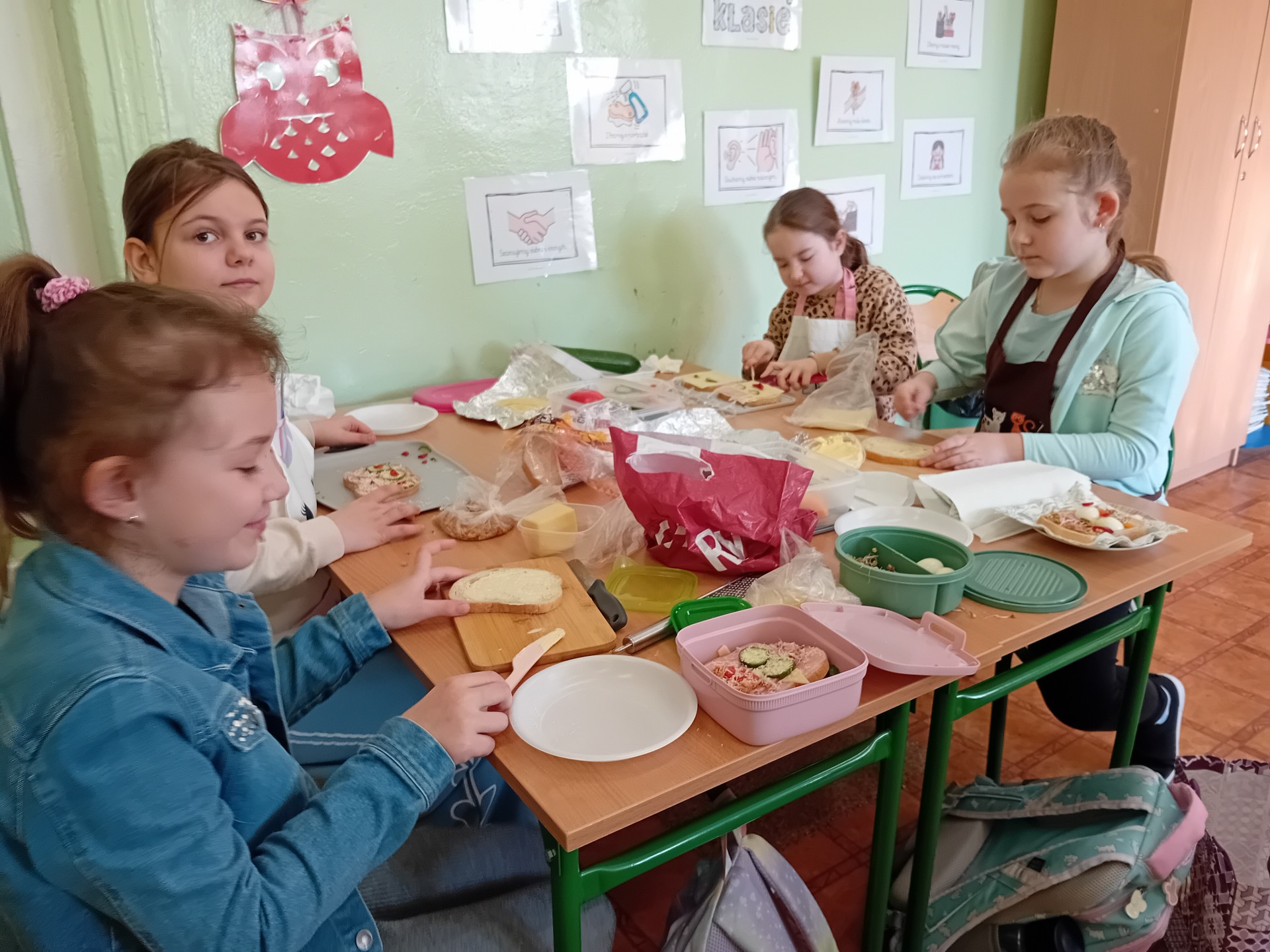 Uczniowie klasy I A wspólnie przygotowywali kanapki w ramach zajęć integracyjnych. Celem spotkania było lepsze poznanie się, rozwijanie umiejętności współpracy oraz budowanie pozytywnych relacji w klasie.