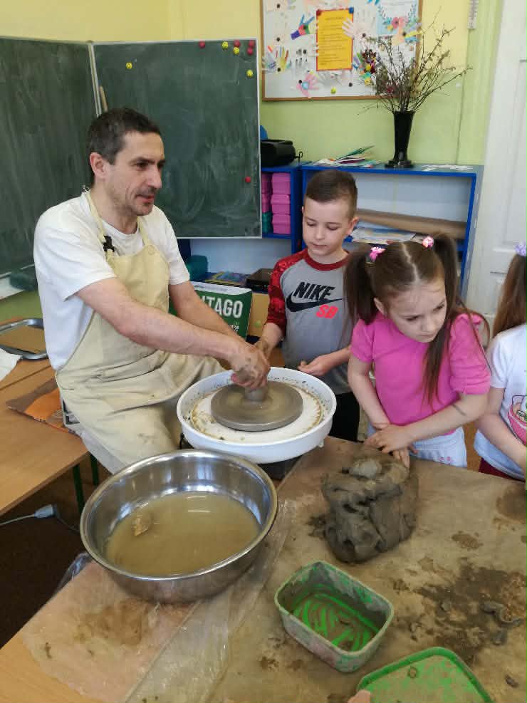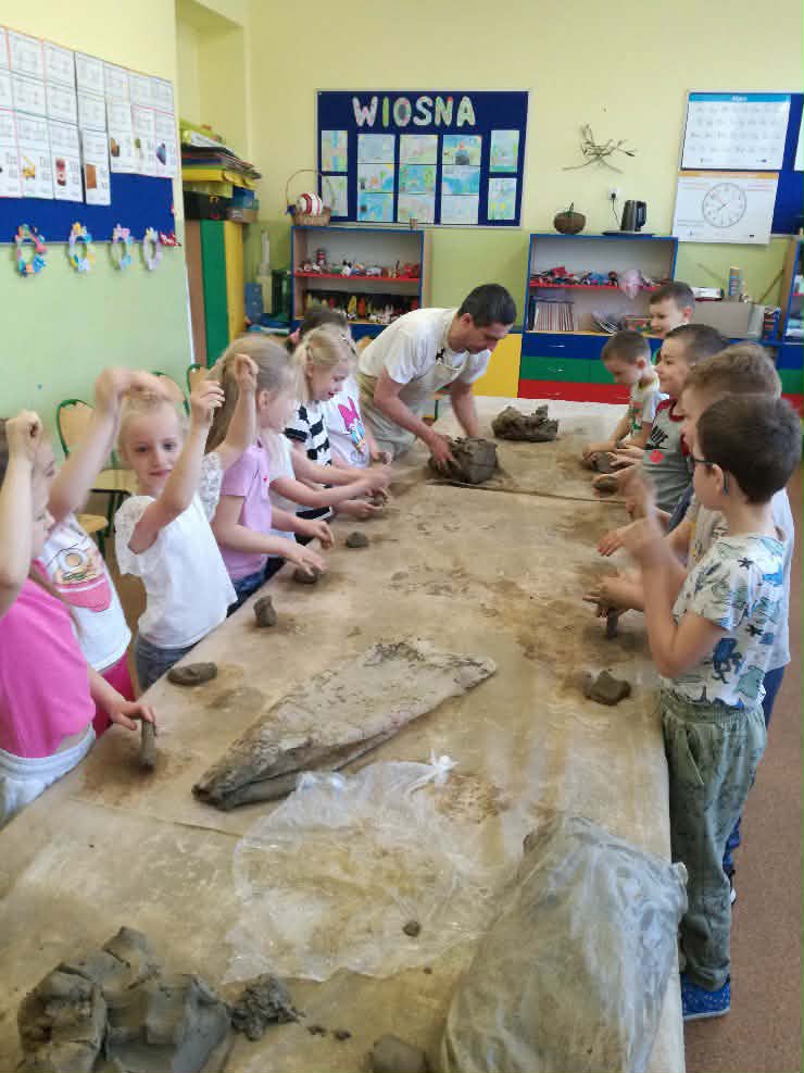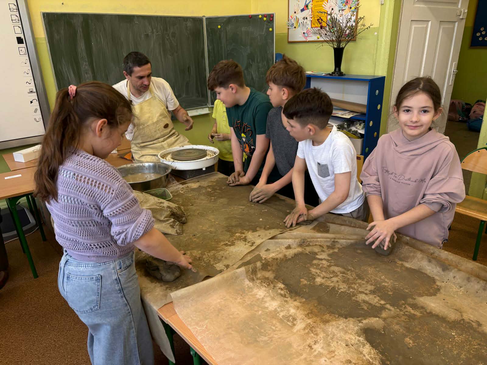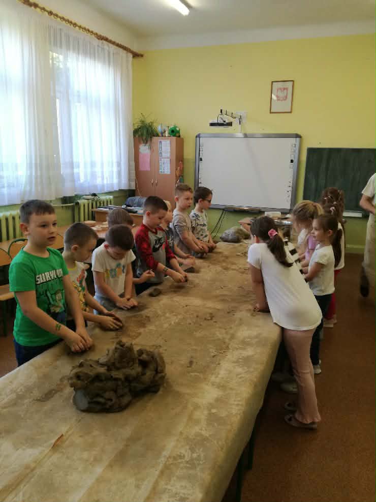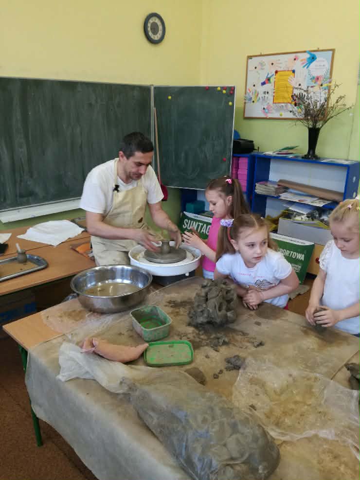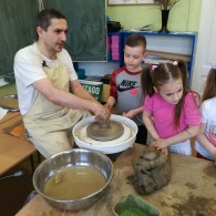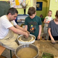 W naszej szkole odbyły się wyjątkowe zajęcia z tradycyjnego garncarstwa. Uczniowie mieli okazję poznać historię tego dawnego rzemiosła oraz przekonać się, jak wyglądała praca naszych przodków. W programie znalazły się: • Pokazy mistrzowskie na kole garncarskim. • Warsztaty praktyczne, podczas których każdy uczeń mógł samodzielnie spróbować sił w toczeniu naczyń na kole. • Ręczne lepienie gliny, co było świetnym treningiem kreatywności i sprawności manualnej. To była niezwykła lekcja historii i twórczej pracy, która pozwoliła nam własnoręcznie stworzyć małe dzieła sztuki z gliny!