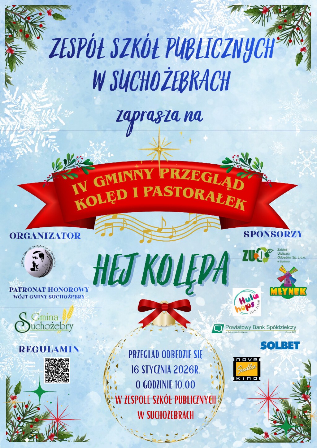 16/01/202616 stycznia 2026r. w Zespole Szkół Publicznych im. Henryka Sienkiewicza w Suchożebrach odbył się IV Gminny Przegląd Kolęd i Pastorałek „Hej kolęda” pod patronatem honorowym Wójta Gminy Suchożebry. Czytaj dalej »