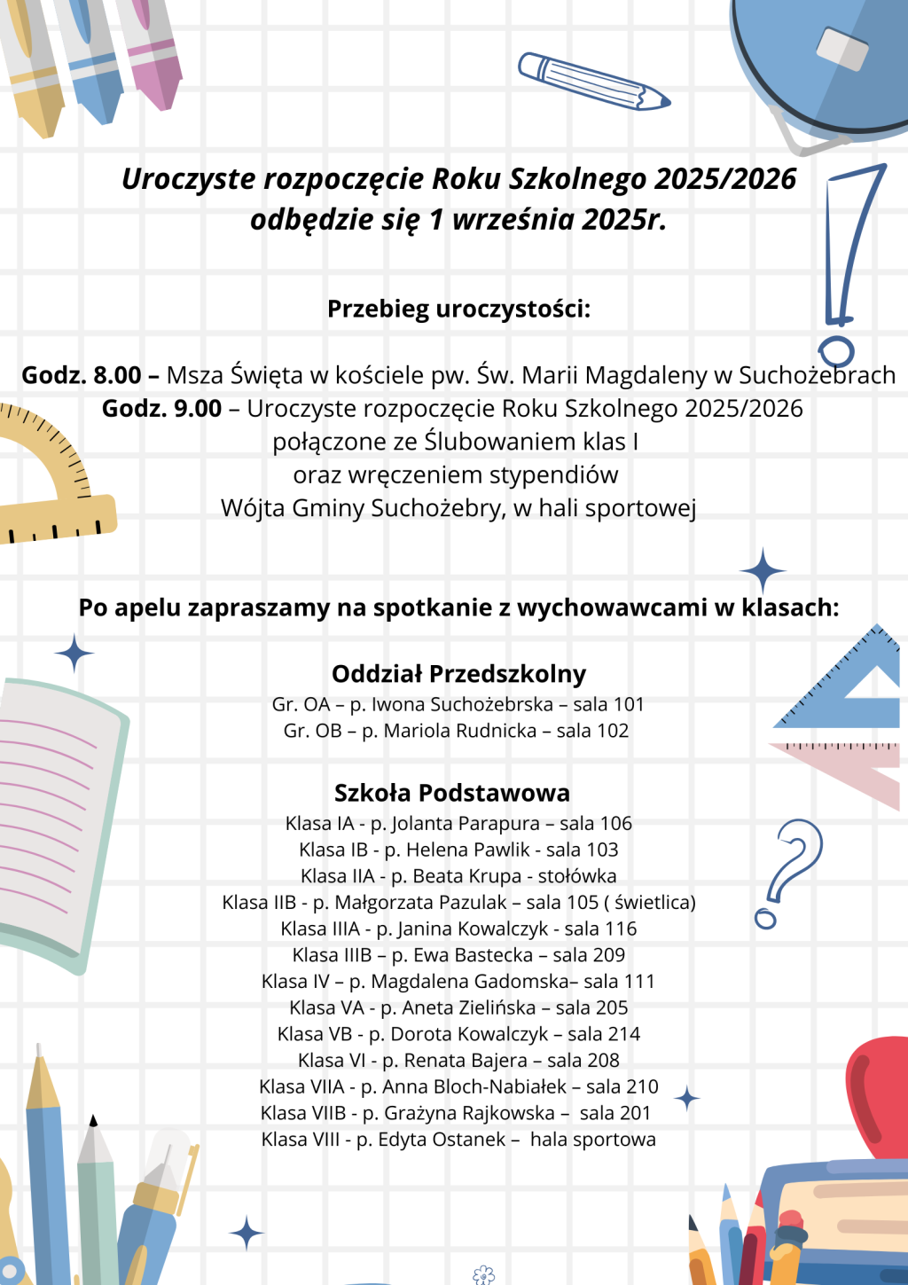 02/09/20251 września w naszej szkole odbyło się uroczyste rozpoczęcie roku szkolnego. Tradycyjnie rozpoczęliśmy je mszą świętą z udziałem dyrekcji, grona pedagogicznego i wójta gminy. Czytaj dalej »